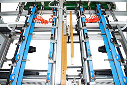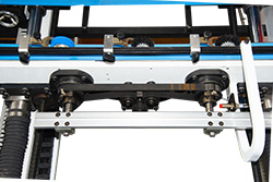 涂膠部中間糊口自動(dòng)粘接采用熱熔膠+封口膠雙道涂膠方式,熱熔膠迅速固定不走位,封口膠粘接加固,確保紙張?jiān)诟邷睾洵h(huán)境下都能持久粘牢;熱熔膠箱采用鑄鋁合金一體壓鑄而成,加溫傳熱速度快;冷膠箱采用不銹鋼涂膠盒耐腐蝕;冷、熱涂膠輪及配合組裝部件均采用不銹鋼材質(zhì)。